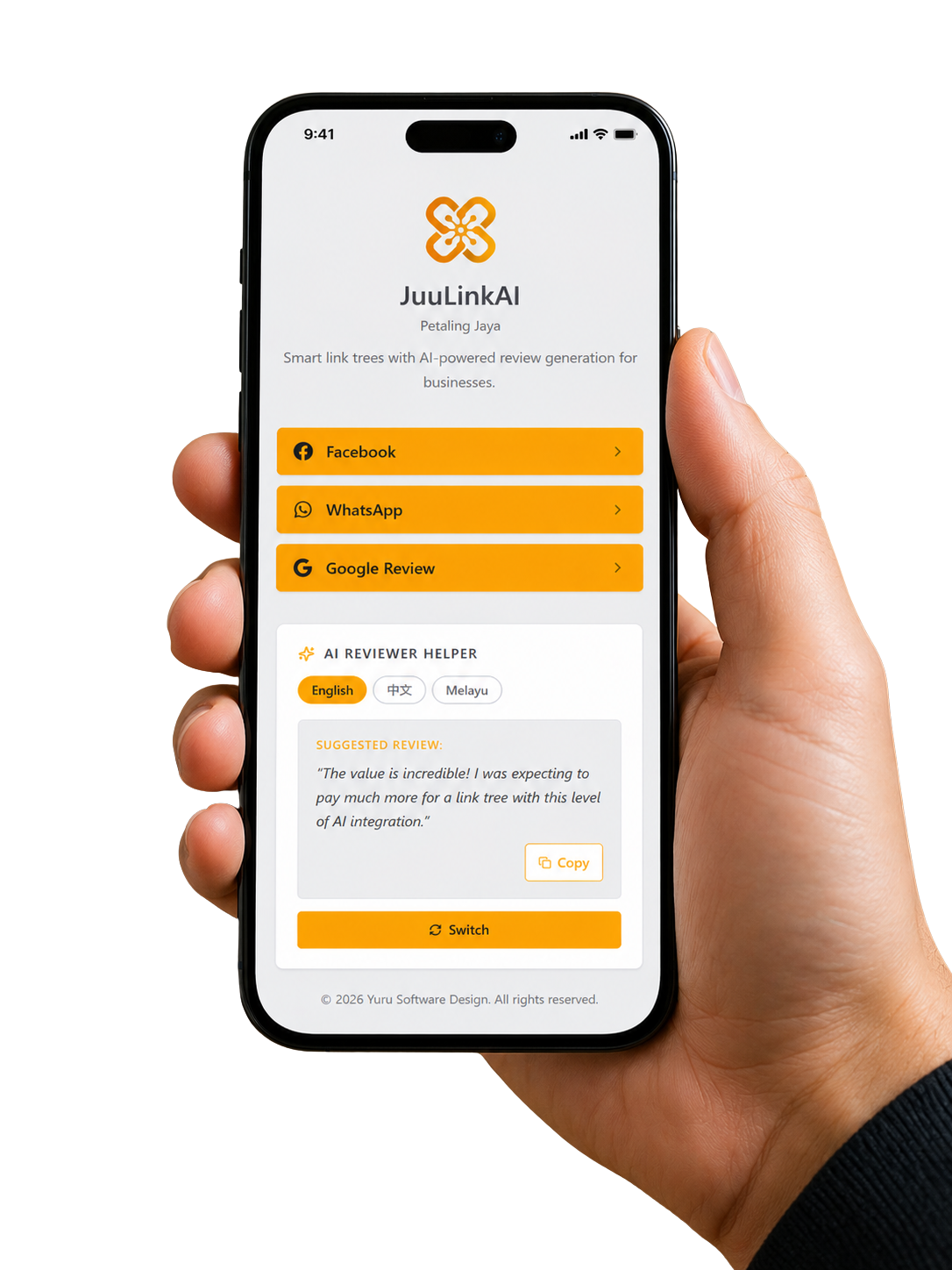 A link-in-bio platform for local merchants, paired with a soft-spoken AI co-pilot that drafts thoughtful customer reviews. One profile, many links — fewer empty fields.